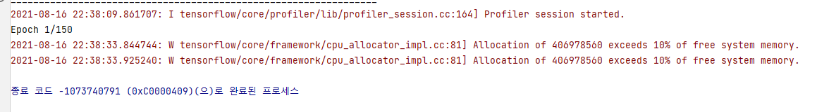 현상 : tensorflow 사용 중 "Allocation of 406978560 exceeds 10% of free system memory" 경고와 함께 오류발생